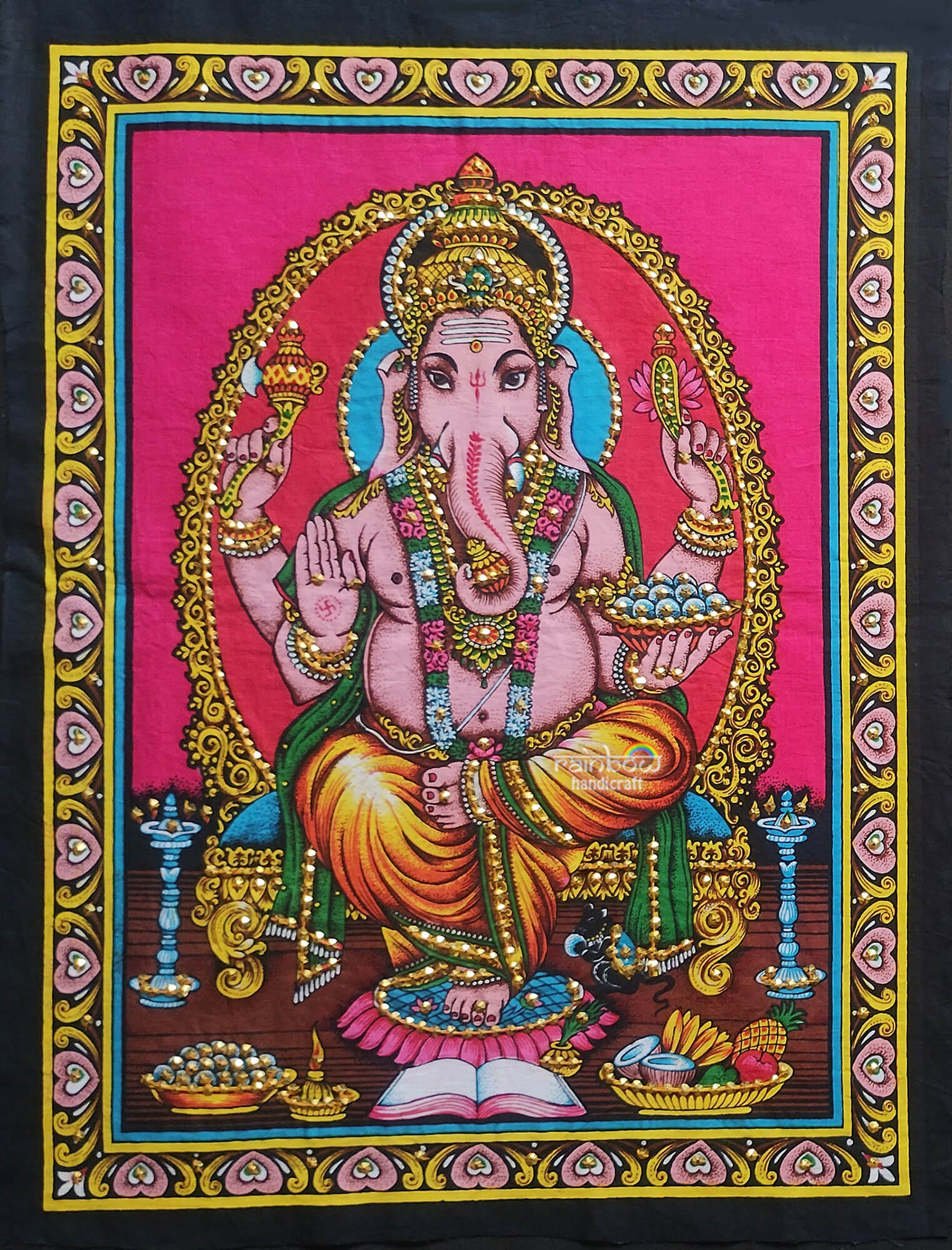 Lord Ganesha, the remover of obstacles and symbol of wisdom and prosperity, is beautifully depicted in bright traditional colors, making this tapestry perfect for home decor, meditation rooms, pooja spaces, yoga studios, or festive decoration.
